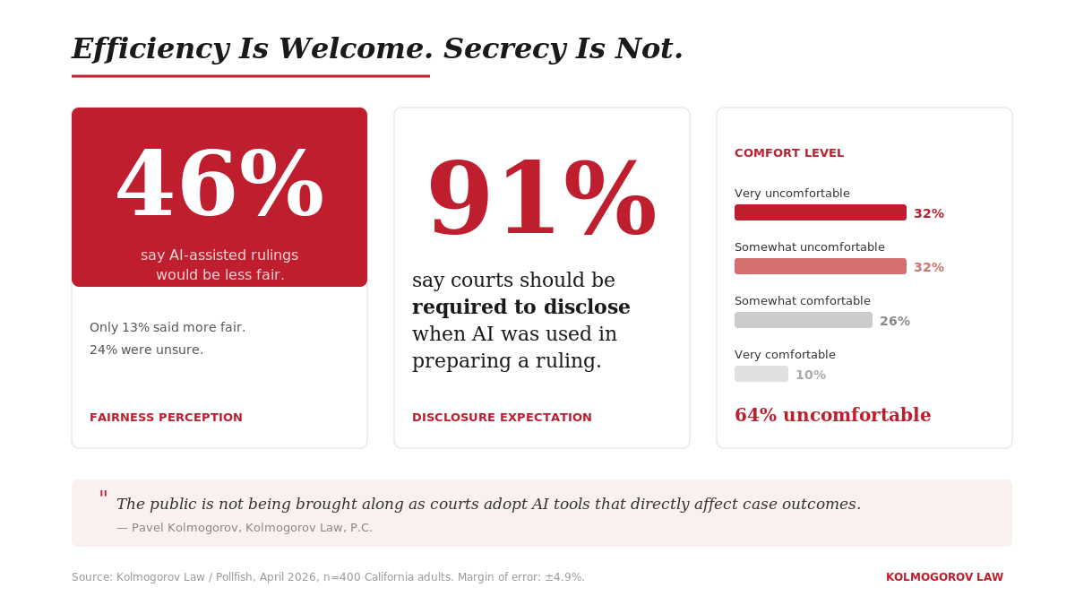 Survey data: Kolmogorov Law / Pollfish, April 17, 2026, n=400 California adults. Legal framework: California Rules of Court, rules 3.1308, 10.430; Standards