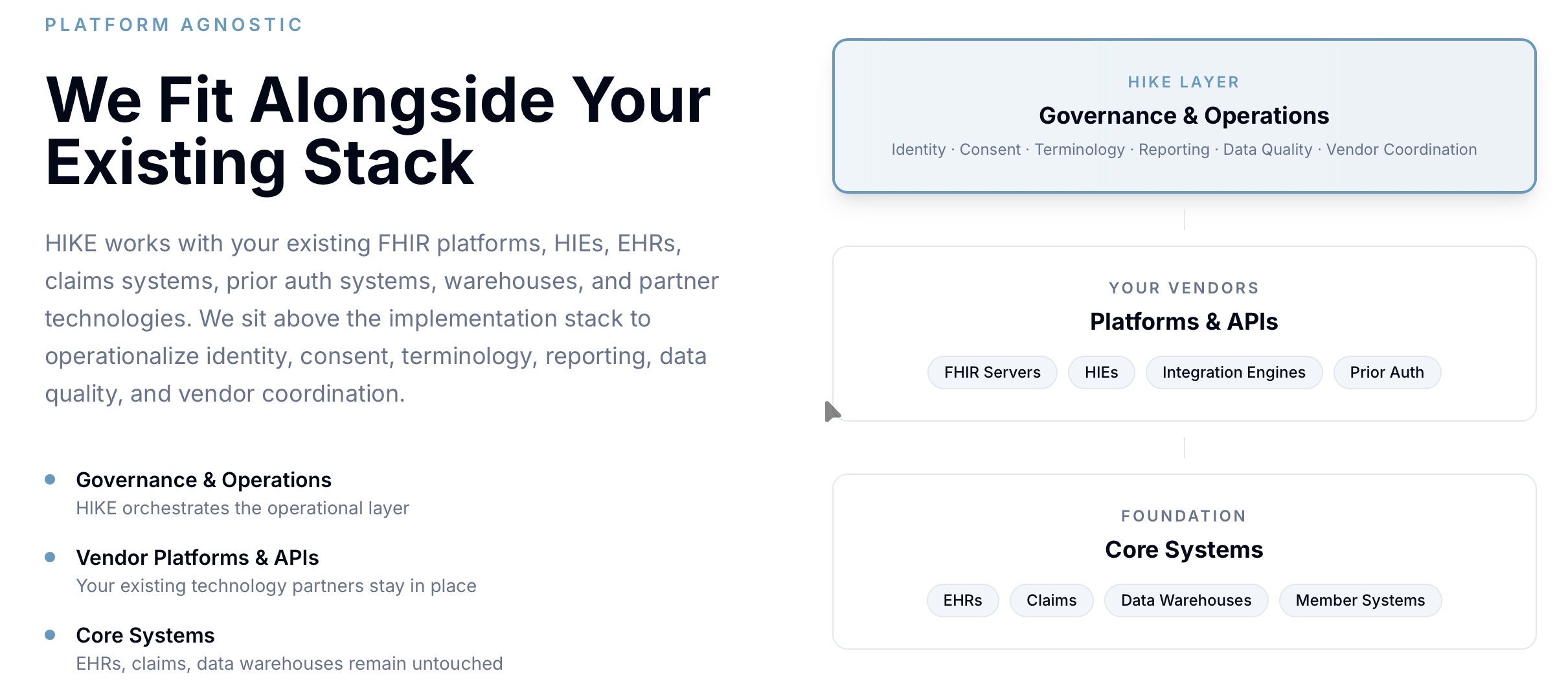 The service is explicitly vendor-agnostic, allowing organizations to integrate preferred EHRs, FHIR servers, HIE platforms, and health IT solutions while still operating under a unified, best-practice interoperability model. Through partnerships with FHIR platform vendors such as Firely, Smile CDR, Rhapsody, Mirth, and others, HIKE Basecamp™ helps clients operationalize a FHIR-native foundation that can support regulatory APIs, clinical data exchange, and innovation use cases without constant rework.